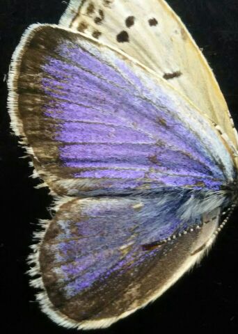 JUGEMテーマ:国産改良品種メダカ めだか販売店、小山メダカセンター店主のブログです。 よくハウスの中の扇風機に、昆虫が巻き込まれて落ちている事があります。 そんな中でシジミ蝶の一種が落ちていたので、羽を撮影してみました。 青く輝いて見えるのは、色素そのものというよりも「構造色」と呼ばれる発色によるものだそうです。 ちなみに魚類でも構造色による発色は知られていて、例えば真っ青に見える熱帯性の海水魚などは構造色によるものが多いようです。 そして観賞メダカでも、幹之系統などに見られる体外光も...