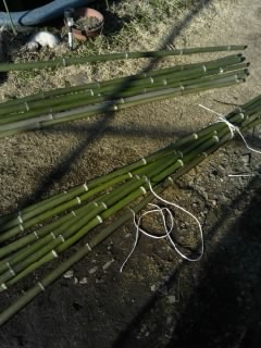 JUGEMテーマ:国産改良品種メダカ めだか販売店、小山メダカセンター店主のブログです。 この時期の関東平野では、晴れていても「空っ風」と呼ばれる冷たく乾燥した強烈な風が吹く日が多いのですが、今日は久しぶりに風も無く穏やかな日和でした。 風さえ無ければ屋外作業もおっくうではない…という事で、以前に調達しておいた竹材があったので、メダカ用ハウスの脇に竹垣を作ってみる事にしました。 何にでも竹を素材に使うだけで「和」の雰囲気が手軽に作れるので、個人的に好きな素材だったりします!?