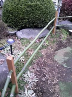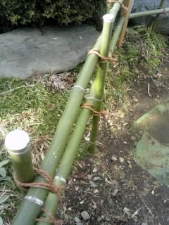 JUGEMテーマ:国産改良品種メダカ めだか販売店、小山メダカセンター店主のブログです。 昨日は悪天候で出来なかった竹垣作りの続きですが、今日は天気も回復してDIY日和という事で、竹垣作りの仕上げをやりました。 前回作っておいた横向きの竹材の合間に間隔をあけて縦に竹材を打ち込み、シュロ縄で結んで完成です。 今回はシュロ縄の結び方にもこだわり、「いぼ結び」と呼ばれる竹垣作り特有の結び方で結んでみました。 手前みそですが、うまく「和」の雰囲気がでて、いい雰囲気に仕上げられたと思います!?