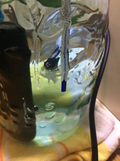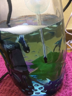 カナフミが再び瓶生活になった。 というのも、フィルターを変えてもすぐに茶ゴケが発生するし、 かといって頻繁に換水もできないしってことで、 一旦フィルターと水槽をがっつりお掃除することにしたもんで。 前にも一度は住んだ瓶なので、すぐに慣れてくれた様子。 底が深いからそれなりに泳げるのと、 餌を入れても四方八方に散らずに済むという利点がある。 水槽だとフィルターからの流水に巻き込まれたりもするから。 私が近寄るとこんな感じでガン見してくるカナ...