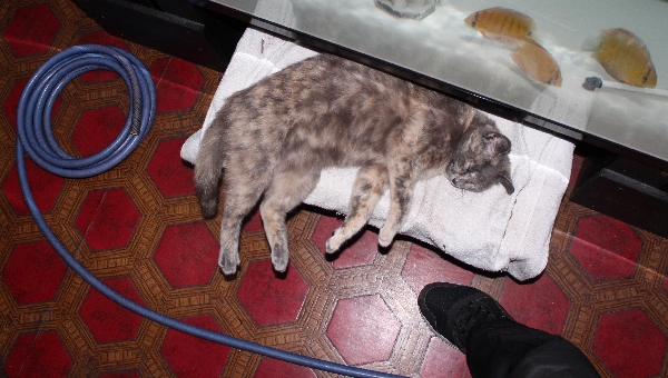 JUGEMテーマ:ディスカス エナちゃん(野良出身)爆睡中! 朝7時半から水換えしていたのですが エナちゃん(野良出身)おかまいなしに寝ています。 昨夜、夜遊びが過ぎたのでしょう 寝ている店長を夜中の3時半頃に 家の外で、中に入れろと鳴いて店長を起こし 店に入り、いつもの寝床で爆睡です。 店長いつも寝不足です。 ...