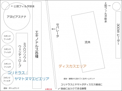 当初はヤマトが捕食される前に逃げられるように作った隙間を 今ではCo.パンダ達が行き交ってます(^_^;) 水槽真上からみた配置になります。 正面の真ん中ぐらいにちょっと斜めにしたセパレータがあります。 この隙間を行ったり来たりしてます。 パンダ達はエサを食べて上部フィルタ給水口からの流れに向かって 軍団でいつも水槽壁面を伝い底から上に昇って行って また降りてくるというのを繰り返しやってます。 それに飽きると自陣のセパレータ内に戻ってきます。 一匹ぐらいは残ってるかなと思うので...