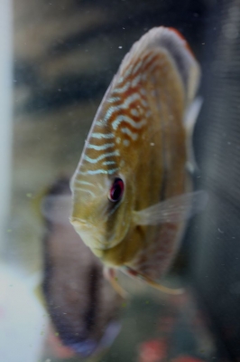 JUGEMテーマ:ディスカス 店長が水替えをしている時 背中に視線を感じ振り向くと エナちゃんでした。 でもよく見ると目を開けたまま寝ています。 そーと カメラを取りに行き写真を撮ったのですが、 しばらくこのままで起きませんでした。 今日のディスカスは 赤系人気品種の レッドダイヤモンドです。 まだまだたくさんの子がいますよ。