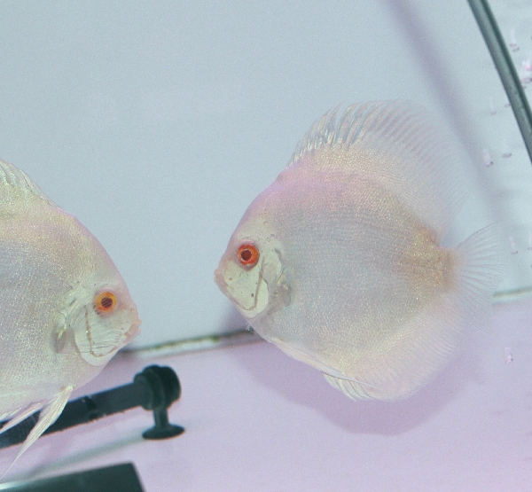 JUGEMテーマ:ディスカス ブログの更新が久々になってしまいましたが アクリル水槽の色とディスカスの体色についての続編です。 通常赤系のアロワナ等によく使われる 底面・背面の二面黒のアクリル水槽に アルビノ系のディスカスを入れている水槽です。 アルビノミレニアムゴールデンです。 さすがアルビノ系 黒かぶりやシミもなく綺麗なままですね。
