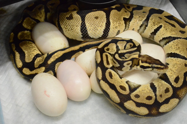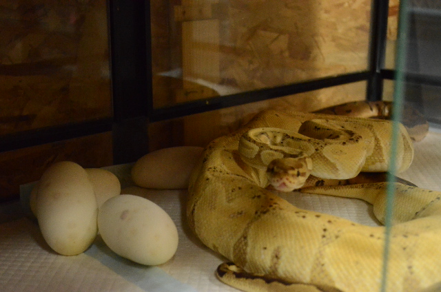 JUGEMテーマ:ボールパイソン 昨日の21時ころから産みはじめ 日付をまたいで1時ころに産み終わりました 合計7個 すべて有精卵 ♂クラウンorパステルクラウン×♀バナナ