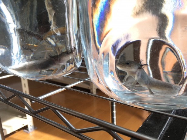 JUGEMテーマ:ウーパールーパー こんばんは! 毎週水曜日に行ってる、ビニールバレーの練習から帰ってきました。 足腰がヘロヘロですが、夜のメンテ(餌やり、清掃等)終了です。 これで今日1日のお店の仕事は終わり! 皆さん、お店に来られた際、カウンター付近にある大きな青いタンクご存知でしょうか??? 2台あるのですが、ここには25-28cm級の、大きな繁殖用ウパが住んでいるんですよ♡ ご来店の際はぜひ覗いてみてくださいねっ! 小瓶の住人のウパたちは、相変わら...