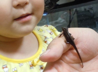 シリケンイモリの刃 食事の後に、しんちゃんの手に乗せられて バンビとご対面。 …なんかすんごーく見られてる…。 なんか、食べられる勢いだけど!? 我家のシリケン仔イモリ刃にポチっとお願いします! JUGEMテーマ:シリケンイモリ