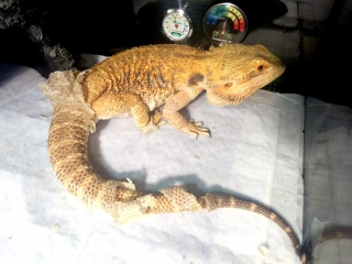 おはようございますジョーさん、今朝もご機嫌麗しゅう。 四肢としっぽの美白化、進んでますね。 後ろ足としっぽは特に白い。 これはいよいよパリッと剥けて来るだろうか。 ライト点灯からもうすぐ2時間が経つので、既に排泄は済んでいた。 毎日快便である。 野菜は小松菜、蕪の葉、インゲン。 ちょっと少なかっただろうか。 ...