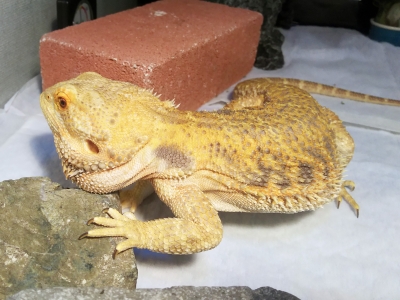 バスキングスポットにて、珍しい向きでポジショニングしているジョーさん。 飼い主の視線に気づいて振り返っているが、首めっちゃ真横に曲がっているな。 そしてその向こう、石の影には排泄物がころり。 これは、ジョーさんには申し訳ないが、ちょっとどいてもらって石を洗わなくてはならない。 という訳でジョーさんに石から降りてもらい、石を洗ってきた。 ジョーさんが乗っかっていた石もや...