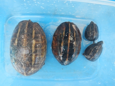 JUGEMテーマ:カメ全般 皆さんこんにちゎ! 家にはミスジドロガメが6匹います! アダルトとベビーですが少し比較をしてみました! こんなにも大きさが違うんです! 左から♀隣が♂そしてベビーです! えらい違いです! 4〜5年位でアダルトサイズになるのかな〜 結構長いな〜〜!