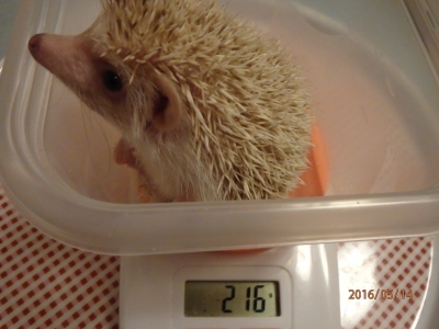 JUGEMテーマ:ハリネズミ 4月28日お迎え時は94g。 5月14日現在216gまで成長した。 成長早いなぁ。 なかなか慣れてくれないけど、すくすく育ちますように。