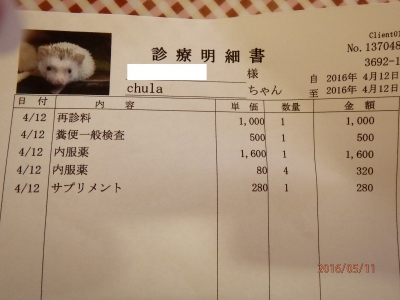JUGEMテーマ:ハリネズミ 今日までの治療費を掲載します。 2月26日〜3月1日:88,580円 ・・・3月3日のブログに明細書を載せています。 3月2日〜4月5日:27,346円 ・・・4月13日のブログに明細書を載せています。 4月6日〜5月11日:76,262円 計:192,188円