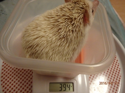 JUGEMテーマ:ハリネズミ 今日はchulaが毎日のんでいるお薬の準備について。 まずは ビタミン剤をスプーンに半分(スプーンはビタミン剤付属のもの) 乳酸菌を4分の1カケをすり潰す 抗生剤を1ml 抗生剤でビタミン剤と乳酸菌を溶かす サプリメントを0.5ml 溶かしたビタミン剤と乳酸菌もシリンジに吸い取る。合計1.5ml 体重測定してみた。 着々と元の体重に戻りつつあって、すごく嬉しい。 これくらいの体重が丁度良いのかな。