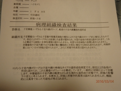 JUGEMテーマ:ハリネズミ 夕べのご飯は完食してくれていた(#^.^#) うんPはしていない。 病院へ連れて行って、食事の報告。 移動中にうんPをしてくれるかと思ったけど、してくれず・・・ 糞便検査は今日はなし。 食事ができているので、今日は様子見で処置なし。 一週間をかけてドックフードとハリネズミフードの割合を変えていき、 最終的にハリネズミフードだけにする作戦決行。 元気になるには、まず食事からだからね!!! あと検体の病理検査結果を受け取った。 診断名 「子宮腫瘤;いずれも子宮内膜ポリープ...