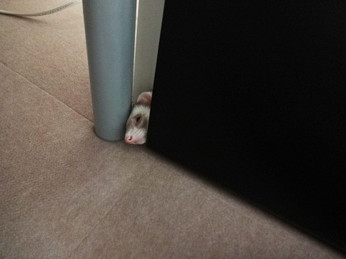JUGEMテーマ:フェレット そのうち慣れるかなと思ってましたが 慣れないようです。 掃除機がはじまると、固まる銀ちゃん。 とにかく何かの中に避難しようとする。 今回はタオルにくるまってましたww 一緒に寝ている熊ちゃんは余裕ですw