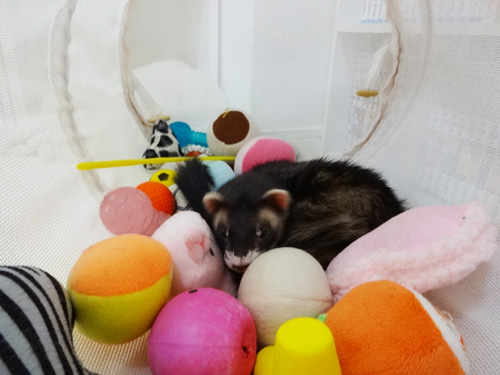 JUGEMテーマ:フェレット 熊ちゃんの最近の寝床 おもちゃに じゃれついている間に眠くなってそこで寝ちゃう おもちゃまみれです。