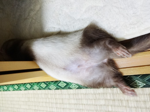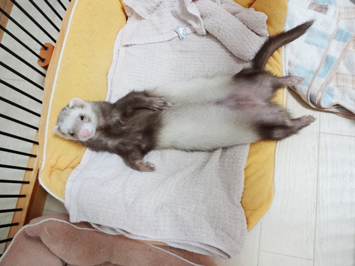 JUGEMテーマ:フェレット 虎ちゃんは暑がりで、ベッドでだらりんとすることが多いです。 こんな感じで… 少し涼しくなってきたので、この姿もそろそろ見おさめ
