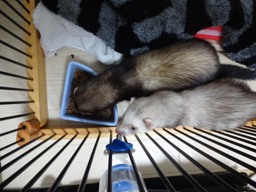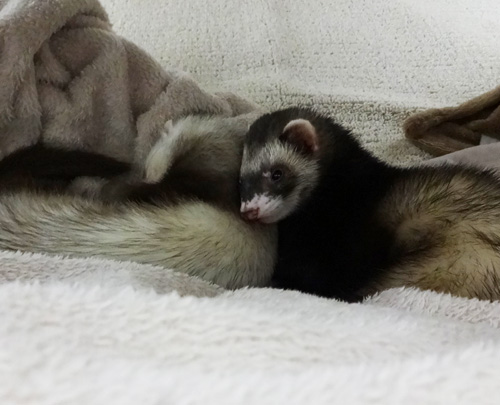 JUGEMテーマ:フェレット 私の足元で寝る二人 すごくカワイイ、けど暑くなります… イタチは体温が高いからね。。 足をどかしたら、虎が文句を言ってました。。 私の足にアゴをのせてたので。。でもさー私だって頑張ったよ。。 一時間、微動だにしなかったよー頑張ったよー!