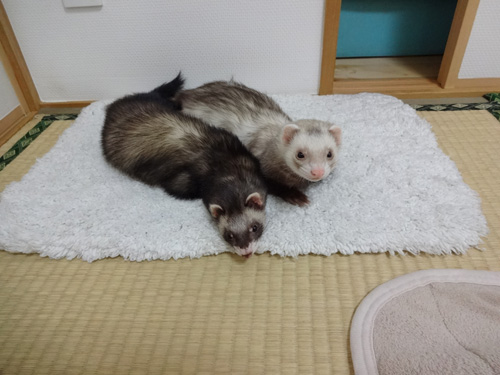 JUGEMテーマ:フェレット 昨日だんなさんの帰りが遅くて 待ちわびているイタチども だんなさんが帰ってくるとオヤツの時間なので イタチ的には だんなさん=オヤツ なのです カメラ目線の虎ww 待ちくたびれてます 結局、午前様で帰宅のだんなさん オヤツをもらったら そそくさと寝ました