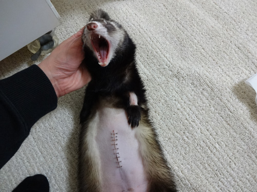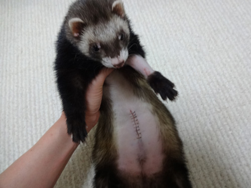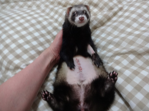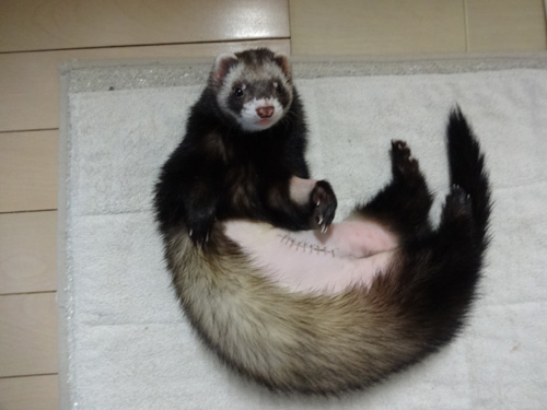 JUGEMテーマ:フェレット ご飯いっぱい食べて すこぶる順調 この写真を撮った後に一箇所糸がゆるんでいるのを発見 キャットドアでお腹を擦るためだと思います… 手術跡は問題なさそうなので、今週末の抜糸までそのまま頑張ります
