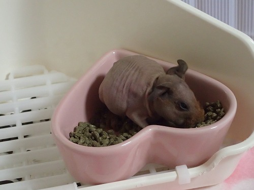 JUGEMテーマ:モルモット 心配して損したと思うほどに、ガリガリしていた赤ちゃんが着実に体重を増やしてきました。 お腹が真ん丸です。 私の大好きな金魚「ピンポンパール」にそっくりになってきました。 自らお皿の中に入ってお食事です。 母親はモルペウスなのですが、結構頻繁にはちみつ丸と一緒にハウスの中に入って寝ています。 くっつけるのであれば、お母さんでなくてもいいのかな… はちみつ丸の方も、時折顔を舐めてやったりしている様子。 仲良く出来...