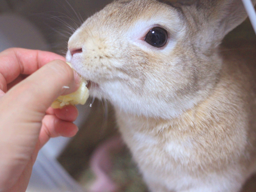 うちのうさぎたちは、バナナが大好きです。 特にアキは、食欲がない時でもバナナなら食べてくれます。 でも糖分が多そうだし、あげすぎるのもよくないかなあと思って、たまのおやつとしてちょっとだけあげることにしています。だから1房買うと、ほとんど私が食べることに……。いや、バナナ好きだからいいんだけど。 おひげについてるよ! 上からあげると、ものほしそうな顔するのがたまらんです。 いじわるして嫌われたくないから、すぐあげちゃう。 この角度からアキの顔を見る...