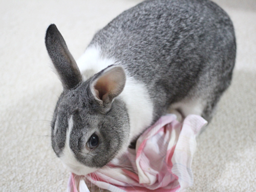 うさぎのいる暮らし。 ハンカチでひとり遊びするフユ。 遊んでほしいなー、と近付いても……。 3DSに夢中で、気付いてくれない……。 ……なんてこともありますよね。