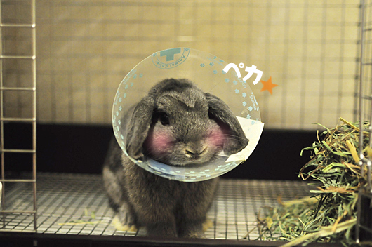 ルイは、エリマキトカゲの生活を1週間頑張り無事卒業できました。 カラー中のケージのレイアウトは、もともとトイレを使えてないこともあって 段差でカラーがぶつからない為にも撤去し、ペレットのお皿は床置きタイプで 底が深いものに”なみなみ”入れておくことにしました。チモシーも床置きです。 気分転換にも部屋んぽは術後翌日から復活させました。とっても元気で カラーをつけていることすら忘れてるくらい、はしゃいでました! 盲腸糞も元から食べようとしていないのか全て落としていて、 盲腸糞を残...