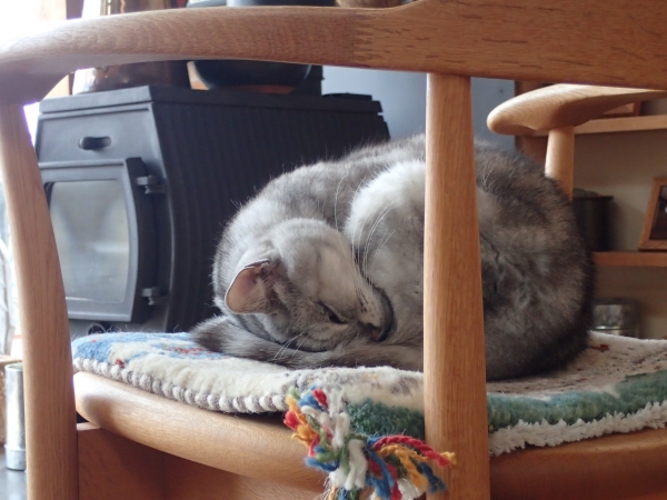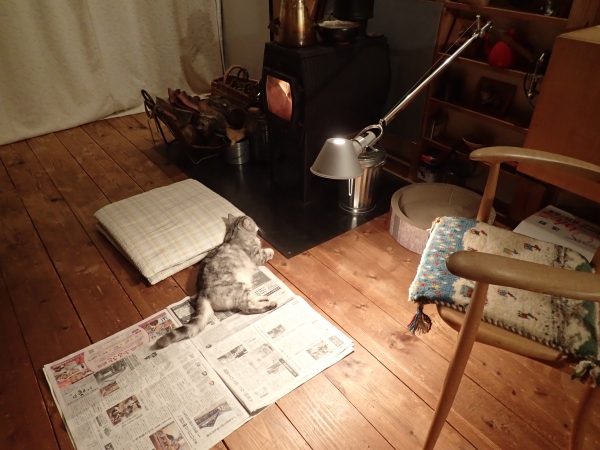 予告:3枚目の写真に、流し目のカマキリさんが登場します。 トーキョ地方の12月は、 晴れさえすれば昼間はポカポカ。 が、さすがに夜は冷えます。 薪ストーブのぬくもりが しみじみ、 ありがたいですな。 猫を読むにも、 新聞を読むにも、 ストーブの前は特等席。 ――と、まあ、 これが正しい冬のはずですが、 なんと、 12月の庭に、 カマキリ母さんが出現。 (12月3日撮影) 左奥にぼんやり写っているのは、 母さん渾身の力...