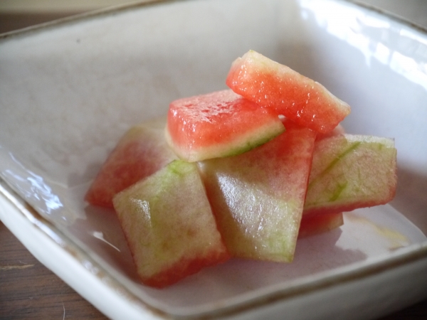 いかがでしょう? なかなか、 おいしそうでしょ? ええ、スイカの皮、です。 材料は、スイカの皮と塩、以上。 白いとこがショリショリして、 赤いとこはほのかに甘く、 適度な塩気と相まって、 うんまい! おばの夏の大好物です。 これが作りたくて スイカを買うようなものです。 オットットはいっさいスイカを食べません。 ひとりでは大玉1個は食べきれないし、 かといって、半割りのラップをかけたのも なんだか買いたくないし、 しかたなく、小玉スイカを使い...