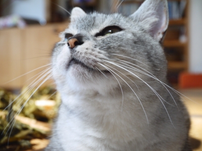 灰色しましまの左のほっぺに、妙なものを発見。 うーん、見えますかしらん? 白い、小さな、ぽち。 どうやらアンテナヒゲが、こじれて生えてきたようです。 どうしてもターゲットに焦点が合わないのですが、 1本だけ、先っちょがマッチ棒の頭みたいに丸まっています。 触るとすごく気にするので、アンテナヒゲなんだと思います。 今後を見守りたいと思います。 * さて、お待たせしました。 例のユリネあらため、ユリ...