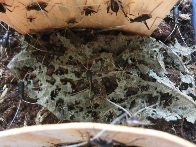 JUGEMテーマ:鳴く虫 7日前から羽化が始まり鳴き始めました。今数匹が鳴いております。中にはまだ3齢幼虫がいたりと、大きさにバラツキがありますが、これは孵化が早かったか遅かったかの違いです。画像のように経木を入れておけば、ここで脱皮します。スズムシのエサをよく食べますが、クズの葉もよく食べます。画像のクズ葉にたくさん開いている穴はスズムシが食べてたあとです。