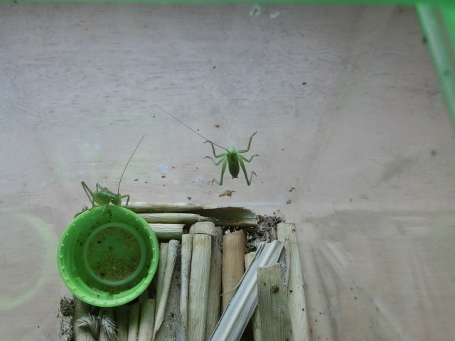 JUGEMテーマ:鳴く虫 ヤブキリ幼虫を採集しました。ヤブキリは数種いますが、シリシリシリ・・・と連続的に鳴いたり、ジリッ、ジリッ、ジリッと自転車のベルのように鳴く種もいます。自転車のベルの音は嫌いですが、やはり自然が織りなす音色と言うのは格別です。ヤブキリの鳴き声は意外と良い声ですね。だから私は毎年ヤブキリを採集して、この良い音色を楽しんでいます。6月から鳴き始めますので、もうすぐですね。 (画像・飼育中ヤブキリ幼虫)