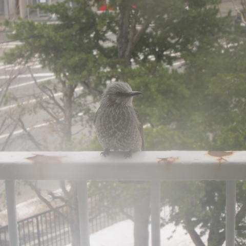 数日間、朝になると甲高いピーピー声が鳴り響いていて、ある日スリ硝子を そっと開けると数羽の鳥たちが我が家のオンボロベランダに停まっていた。 驚かせないように曇った硝子戸の向こうから一枚だけパチリ。 巣立ち前に母鳥と一緒に飛ぶ練習をしてたみたい。 野鳥の会のHPで調べて、たぶんヒヨドリの子だと思うんだけど自信ない。 全体にまだふわふわだけど、くちばしや足の爪はキリッとしてて野鳥の風格。 住宅街はカラスと最近はカモメもいるから、負けずにがんばれ! JUGEMテーマ:鳥が好き...