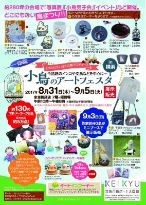 本日、8/31から、横浜京急百貨店(上大岡)にて 『小鳥のアートフェスタin横浜』が開催されています。 販売スペースが去年より更に拡大されて、 ものすごい事になっています…。 私も『月の魚』で参加しています。 新発売は文鳥のコースターを2種類。 あわさん&ごまさんのメモ帳。 ガラスの羽根入れ。 モバイルバッテリー2種類も販売しています。 ガラスの羽根入れは3日の対面販売の時に その場でアレンジも出来ると...