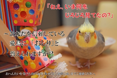 JUGEMテーマ:鳥が好き! 「おちり、のぞかれるから!」 そらおくんへぽちっと応援頂けると嬉しいです にほんブログ村 「オカメインコのそらおくん」@okamesorao きしかん@kishikansora