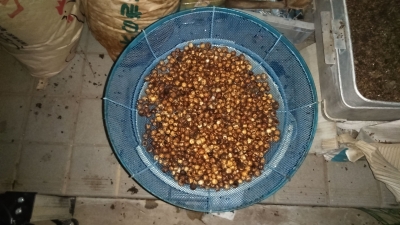 JUGEMテーマ:農業 月曜日に収穫しておいたタイガーナッツを洗って干します。 我が家にはうまく干すものや場所がないと思ったので 野菜干しネットを買いました。 それが届くのが今日の水曜日。 夜の10時からタイガーナッツ洗浄開始。 バケツに入れて、もみ洗いしました。 水を変えて3回洗浄。 下の写真は、3回洗った後に、ざるに広げた状態。 洗い方もよくわからなかったので、バケツで洗いましたが、泥が底にたまって 最初のころの洗浄はタイガーナッツが泥に埋...