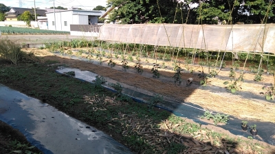 JUGEMテーマ:農業 義父の趣味の畑です。家の隣の畑。 プチトマトの雨よけ作成の手伝いをしました。 道具があちこちに散らばっていて、なんとかそろえた。 形になったかな。 丸パイプは寄せ集めなので長さがそろっていません。 画面右側はそろっていますが、奥側(画面左側)はバラバラ。 ビニールも、幅が半分くらいしかないので 頂点付近で重ねて2枚を使用しています。 (というか、長いシートを奥側で折り返して2枚使いのようにしている。) なので、通常は横のパイプは3本...