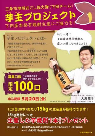 JUGEMテーマ:農業 皆さんご存知の通り、僕は畑に関してまったくのど素人です。 ですが、近所のお爺ちゃんやお婆ちゃんが親切に教えてくれるおかげで、最近はなんとか畑が形になってきました。 そんな中、とても興味深い話が耳に飛び込んできました。 それは「芋主プロジェクト」です。 これを簡単に説明させていただくと、サツマイモの生産が盛んな下田地域でサツマイモを育て、それを集めて芋焼酎を作ろう!といったプロジェクトです。 僕は畑も始めたし、サツマイモが大好きだし、酒が大好きだし、かなりの勢いで...