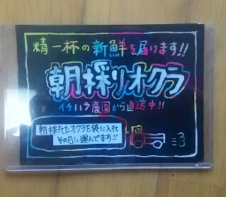 JUGEMテーマ:農業 お久しぶりです、嫁です。 最近オクラが採れる様になりました。 (私はまだ収穫してないけど‼) これから十月までの間毎日収穫する事を考えると 嬉しい様な悲しい様な…自分の性格が嫌になります(´ω`; こんな私でも使ってくれるたけしさんはすごいなぁと毎日尊敬。 さて、オクラですが 昨日は雨が降ったせいか 昨日と同じ13袋分でした‼ 今日も「よってネ市」さんと「すきとく市」さんにお世話になりまーす‼=3 あ、そうだ。 ポップ作らないと&hellip...