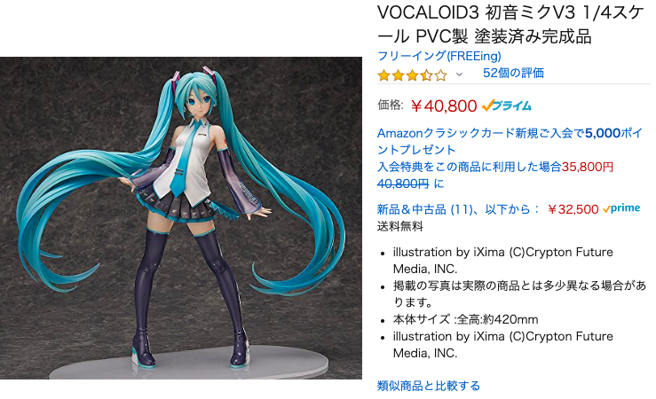 高浪ひろしの「サブ物販ブログ」です。 今日も、おはようございます。 JUGEMテーマ:せどり 初音ミクの狙い目商品を、お送りします。 商品名 : VOCALOID3 初音ミクV3 1/4スケール PVC製 JAN : 4571245295460 塗装済み完成品となります。 Amazonの販売価格 : 40800円 参考価格 : 28315円 差額 : 12485円 初音ミクは限定フィギュアが利益がで安いです。 ただ、初音ミクは評判がよく人気が高いのですが、 その分、商品の種類が多く...