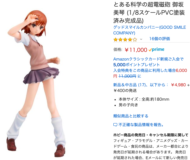 高浪ひろしのお宝フィギュア紹介のブログです。 本日もお疲れ様です!! 今回はとある科学の超電磁砲よりプレミア商品情報を、お送りします! 商品名/ とある科学の超電磁砲 御坂 美琴 (1/8スケールPVC塗装済み完成品) 御坂 美琴 (1/8スケールPVC塗装済み完成品) 販売額/11000円 定価/5966円 差 額/5034 円 十分な利益率が確保できますね! なお、janコードは、798256959202です。 それから、マクロスのフィギュアも相...