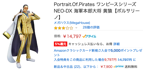 高浪ひろしの「サブBLOG」です。 ワンピース玩具転売の利益の出るフィギュアを紹介します! アマゾンで黄猿フィギュアの相場が高騰中! 商品名: Portrait.Of.Pirates ワンピースシリーズ NEO-DX 海軍本部大将 黄猿【ボルサリーノ】 amazon相場額:14797円 定価(仕入額):7920円 差額:6877円 janコード:698887830249 ドンキホーテで売っています。 その他にもイオンで売っているゾロのフィギュアも4000円ほどの利益がでました。 ...