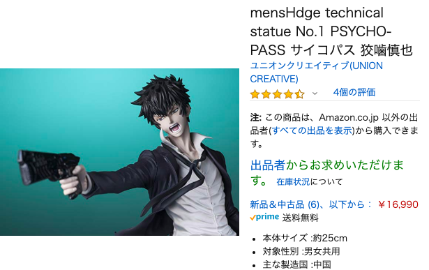 高浪ひろしです。おはようございます。 サイコパス玩具のプレミア商品をお届けします! 商品名: PSYCHO-PASS サイコパス 狡噛慎也 mensHdge technical statue No.1 amazon販売価格:16990円 参考価格:11000 円 差 額:5990円 サイコパスはシーズン3がAmazonプライムで公開中です。 また、サイコパスのドミネーター玩具は、 人気YOUTUBERのはじめ社長が、YouTubeで紹介をしたことで、 話題にもなりました。 サイコパスは人気シリーズ...
