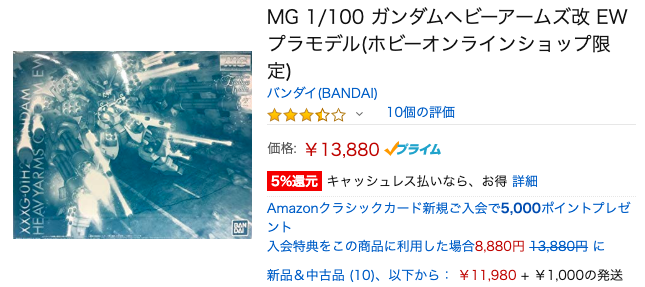 高浪のプレミア商品の紹介です。 こんばんは。 今回は、ガンダムのプラモデル(ガンプラ)で 相場が高騰中の商品を紹介します。 商品名: MG 1/100 ガンダムヘビーアームズ改 EW プラモデル(ホビーオンラインショップ限定) アマゾンの販売額:13880 円 参考価格:5184円 差 額:8696円 janコード:4549660116301 仕入先は、ホビーオンラインショップです。 ガンプラはMG(マスターグレード)の 比較的に参考価格が高い限定商品を狙...