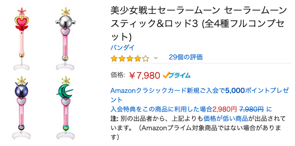 高浪ひろしです。こんにちは! 今回は、 美少女戦士セーラームーンの玩具を転売して、 利益の出る狙い目商品を紹介します。 商品名 : 美少女戦士セーラームーン セーラームーンスティック&ロッド3 (全4種フルコンプセット) アマゾン販売価格 : 7980 円 定価(仕入) : 2000 円 差額 : 5980円 jan : 4543112957696 こちらの美少女戦士セーラームーンの玩具は、 フルコンプリートする必要があります。 適当に何...
