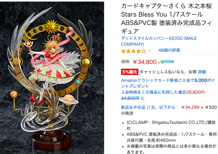 高浪ひろしです。本日もお疲れさまです。 カードキャプターさくらのお宝商品を、お届けします! お宝商品名 : カードキャプターさくら 木之本桜 Stars Bless You ABS&PVC製 塗装済み完成品フィギュア なお、1/7スケール です。 アマゾン販売額 : 34800円 定価(仕入) : 25463 円 差額は、なんと9337円です!! jan : 4571368442833 カードキャプターさくらは男女ともに、 評判がよく、人気にアニメです。 需...
