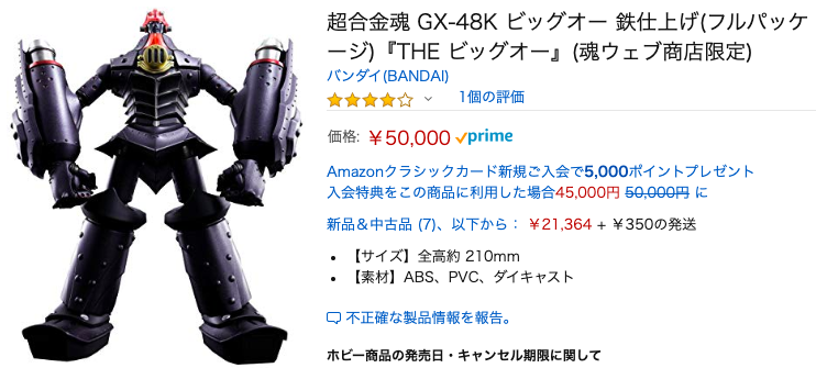 高浪ひろしのサブ物販ブログです。 本日もお世話になっています。 今回は、超合金魂のプレミア商品情報をお送りします! 高浪ひろしのおすすめ商品名: 超合金魂 GX-48K ビッグオー 鉄仕上げ(フルパッケージ)『THE ビッグオー』 アマゾンの販売価格:50000 円 定価(仕入額):23760円 差額:26240 円 JAN番号:4549660208549 魂ウェブ商店限定のフィギュアです。 この他にもお宝フィギュアがあります! それはこ...