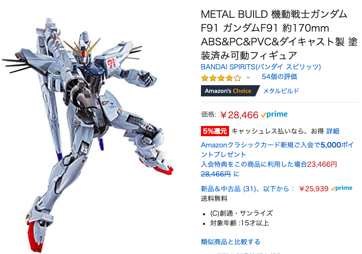高浪ひろしです。本日も今晩は。 今回も狙い目商品情報を、お送りします! テーマはガンダムF91です。 高浪ひろしのおすすめ商品: METAL BUILD 機動戦士ガンダムF91 約170mm ABS&PC&PVC&ダイキャスト製 塗装済み可動フィギュア amazon相場額:28466 円 定価:20900円 差額:7566 円 jan:4549660112631 F91は人気のガンダムです。パイロットはシーブックです。 劇場版ガンダムで、昔の映画ではありますが、今でもなお評判がよく人気です...