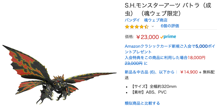 高浪ひろしです。本日もお疲れさまです。 このバトラ商品は仕入れましたか? 商品名/S.H.モンスターアーツ バトラ(成虫) (魂ウェブ限定) amazonの相場額/23000 円(販路/アマゾン) 参考価格/6480円 差額/16520 円 jan/4543112736703 仕入先は魂ウェブです。 バトラも映画の評判もよく、人気が高い怪獣です。 高浪ひろしはバトラよりもモスラの方が好きかなぁ?笑 本日紹介したバトラのフィギュアでどう稼ぐかは、 高浪ひろしの公式物販ブロ...